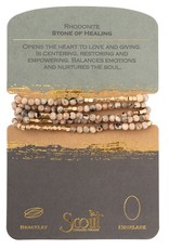 This convertible bracelet and necklace features semi precious gemstones (rhodonite.) It can be wrapped 4-5 times as a bracelet and 1-2 times as a necklace and is 34". Please note that the stones can vary slightly from this picture.
